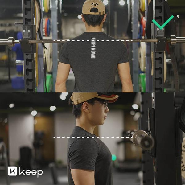 肩胛收紧、锁定,肘部下沉不要上扬,杠铃的位置正好位于收紧的斜方肌上侧。