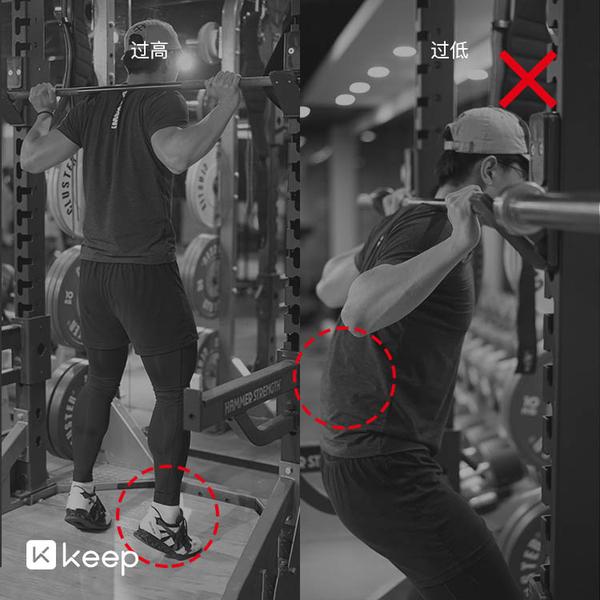 杠位过低:出杠和回杠时不得不额外下蹲甚至弯腰,特别是回杠时一般体力不太充足的条件下,很容易弯腰、对腰椎形成受伤风险。