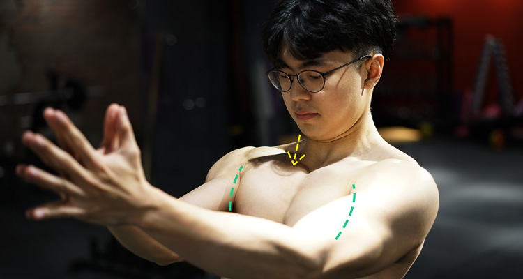 手掌相对,相互发力,同时挺胸,然后做胳膊的伸展和曲屈。在这个过程中,可以通过镜子观察,或者低头观察胸部肌肉收缩,从而加强发力感。