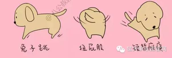 CHD几大症状:兔子跳、走路扭屁股、无法长时间奔跑。得了CHD的狗起立和起跑时有困难,走起路来左右摇晃,上台阶或跳跃时也有问题。轻者,狗在歇息后再运动时,会发生短暂瘫痪,只能拖着后腿向前走;如果长时间地站立,会时不时地抬起后腿小憩。重者,例如得了双侧CHD,狗甚至无法站立。
