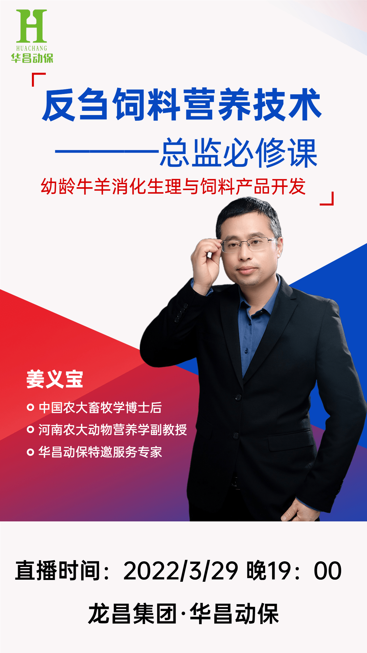 3月29日晚7:00,华昌动保特邀大咖河南农大动物营养学教授、反刍行业专家姜义宝教授从幼龄牛羊消化生理特点、营养需求特点到幼龄牛羊料原料及功能性添加剂的选择等诸多方面,畅谈《幼龄牛羊消化生理与饲料产品开发》,聚焦热点干货满满。