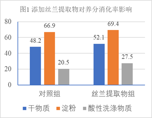 试验研究了高纤维型日粮添加丝兰提取物,对处于泌乳后期奶牛饲料消化率的影响。丝兰提取物的添加显著增加干物质消化率(增幅8.1%),而淀粉和酸性洗涤纤维(ADF)消化率分别上升3.7%和34%。这有力的说明了丝兰提取物可以促进瘤胃发酵,提高饲料消化率。