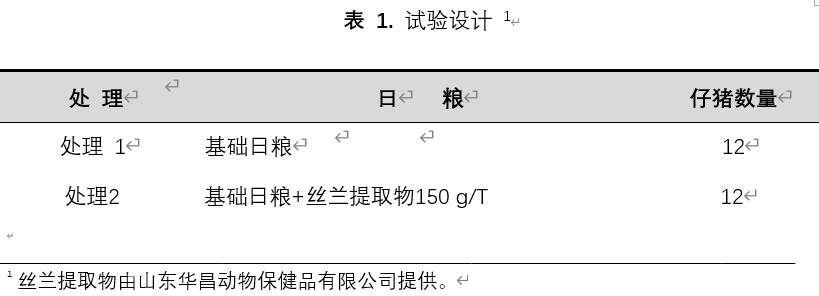 试验按体重一致原则随机分为 2 个处理组,每个处理 12 个重复,每个重复 1 头仔猪(单笼饲养), 具体试验设计见表 1。试验分两个阶段,分别为断奶后 1-14 天和断奶后 15-28 天,试验周期共 28 天。