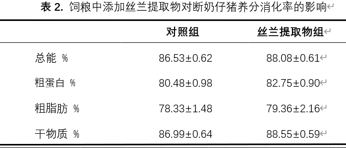 如表 2所示,丝兰提取物组仔猪的养分消化率均高于对照组,添加丝兰提取物的试验组总能、粗蛋白、粗脂肪和干物质的消化率均有显著提升,其中总能消化率和干物质消化率提升较为显著,均比对照组提高了 1.8%。