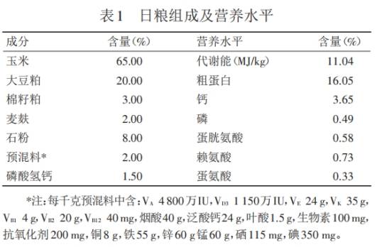 3 层阶梯式笼养,自由采食和饮水,自然光照辅以人工光照,光照16 h。各组饲养条件一致,采用常规免疫程序进行免疫接种。预试期1周,正试期6周。