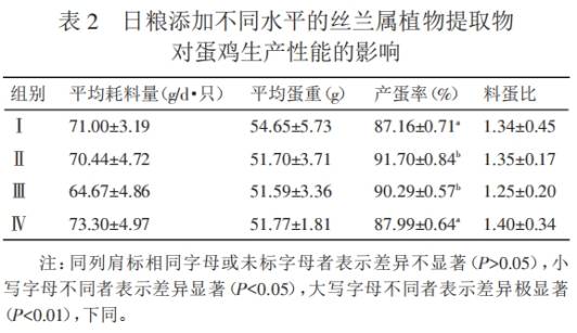 由表2可见,各试验组与对照组平均耗料量之间没有显著性差异(P>0.05),但是、组产蛋率显著高于对照组(P<0.05)。