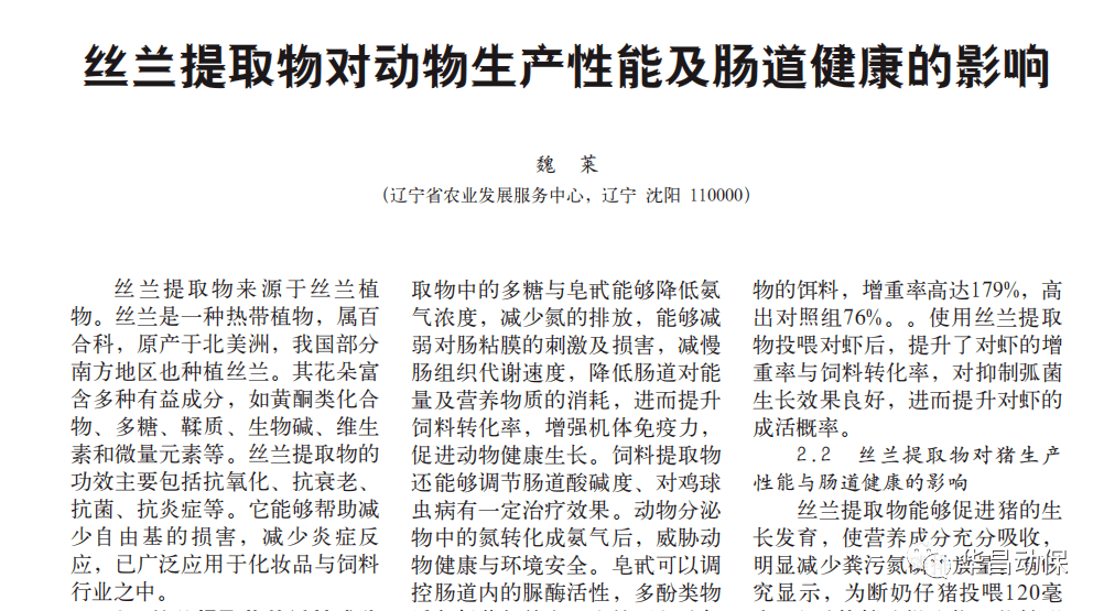 以下所有数据来源均来自:动物生产.魏莱《丝兰提取物对动物生产性能及肠道健康的影响》2323.3 (辽宁省农业发展服务中心,辽宁 沈阳 110000)