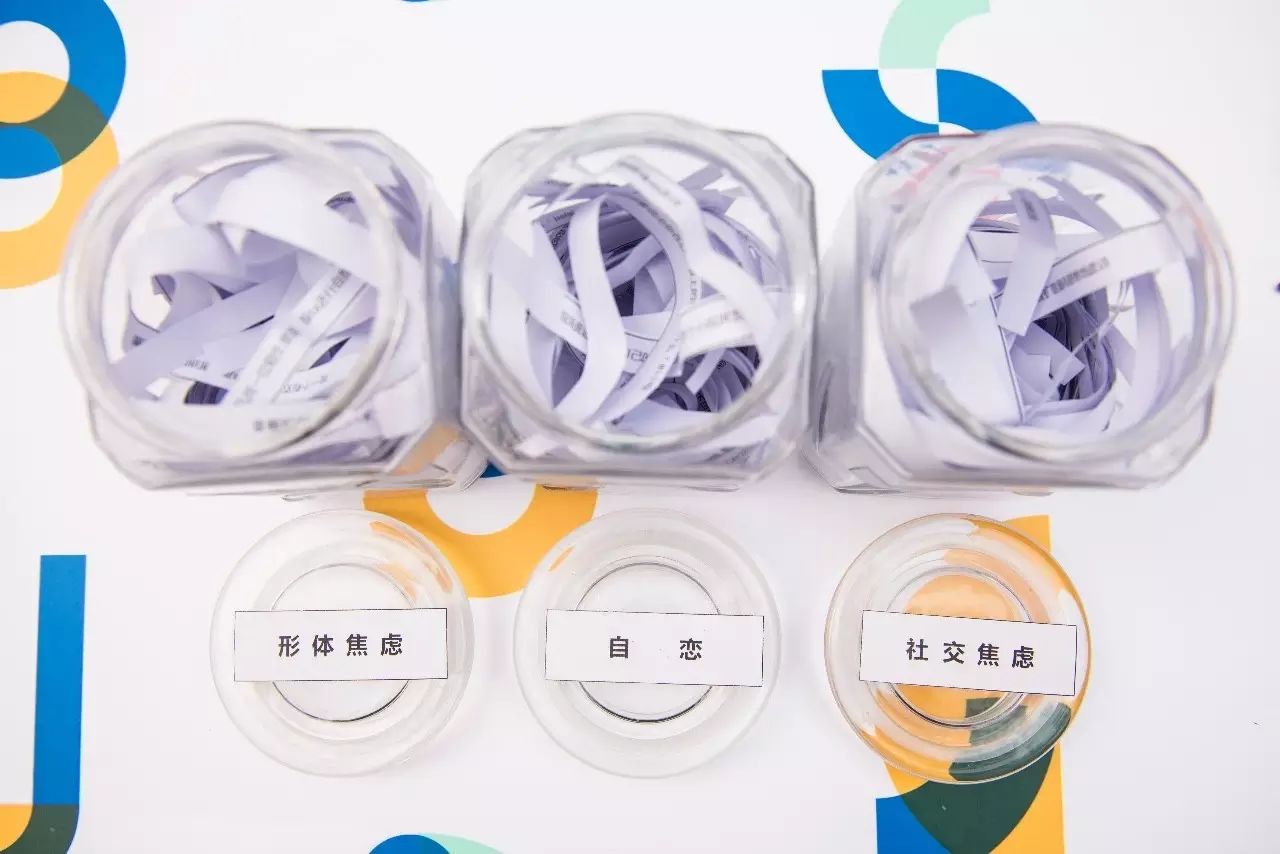 前来挑战的小伙伴可以从装有“社交焦虑”、“形体焦虑”、“自恋”的3个主题罐子里,看自己哪方面“病得最重”,就从中随手抽取一张挑战纸条,如果在现场成功按照纸条上所写的指示完成挑战,即可获得拍立得美照1张或KY限定手机壳1个!