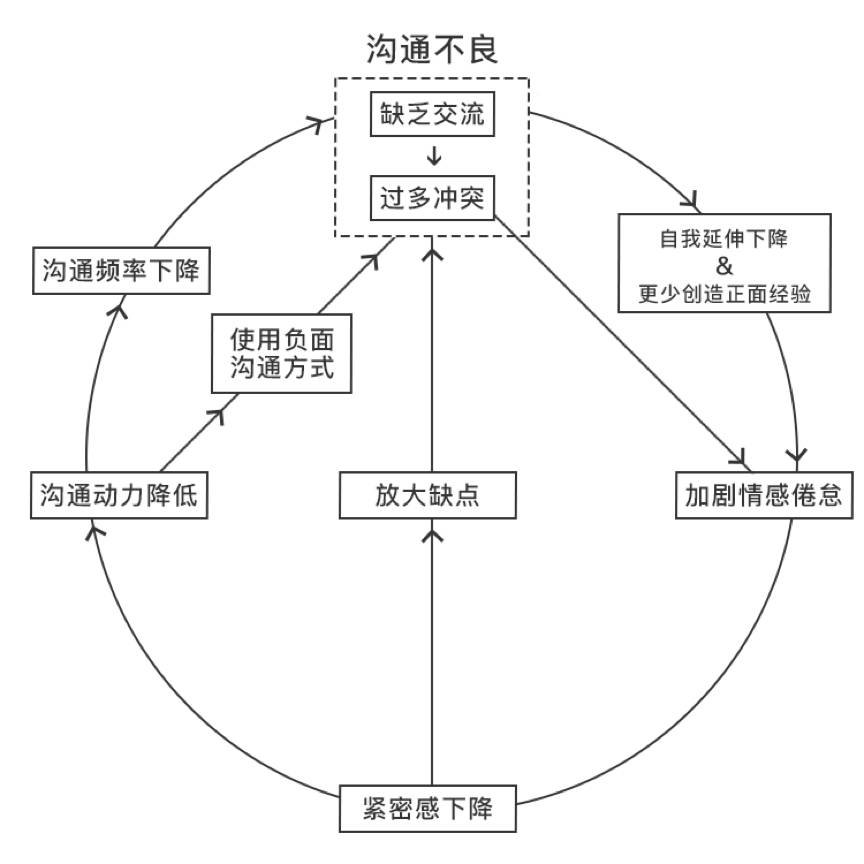 沟通不良又会进一步加剧关系倦怠。首先,缺乏交流可能会导致自我延伸能力的下降,因为如果我们不和伴侣交流,我们也就没有办法了解与学习伴侣身上新的经验。其次,缺乏交流也会影响到我们去创造新的正面经验,因为我们没有办法告诉伴侣我们希望有什么样的美好经验,也没有很多机会和伴侣商定在什么地方、什么时候一起创造正面的经验。