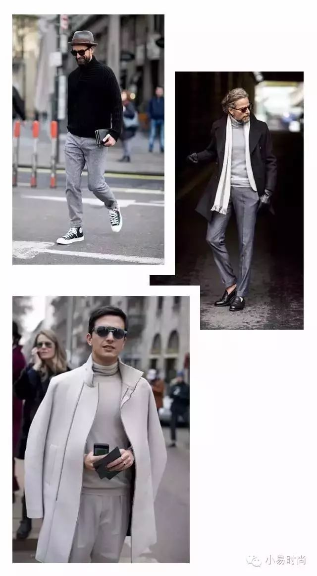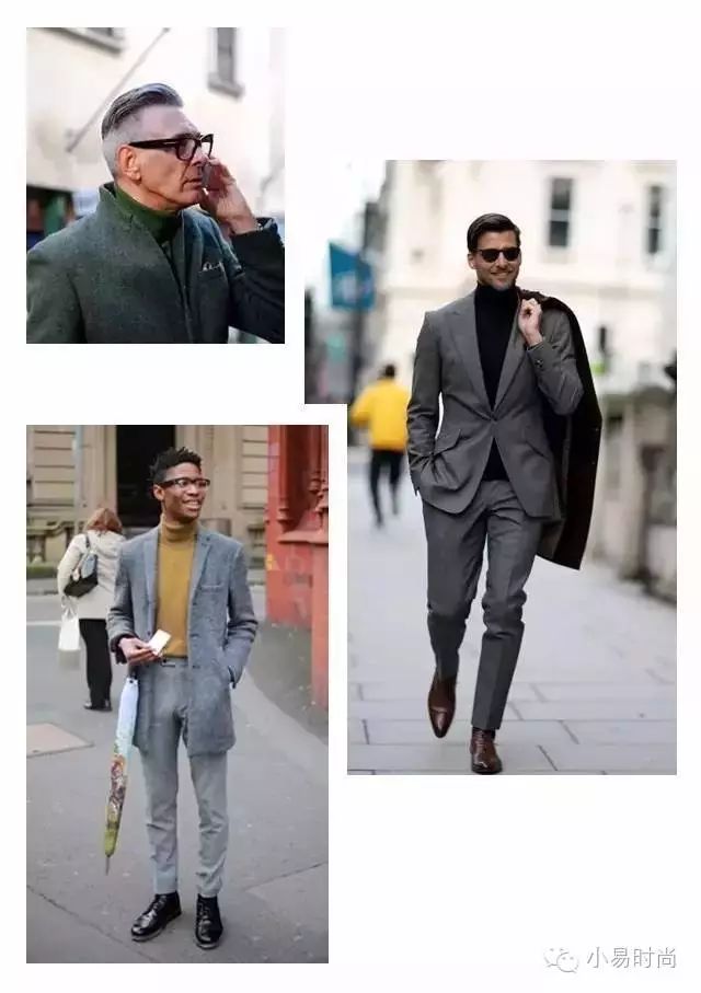 当西服与裤子是同样的沉稳色时,可以选择姜黄等颜色跳脱的高领衫来做内搭;也可以高领衫和西服、高领衫和裤子保持色彩统一,用第三件来调和色彩。