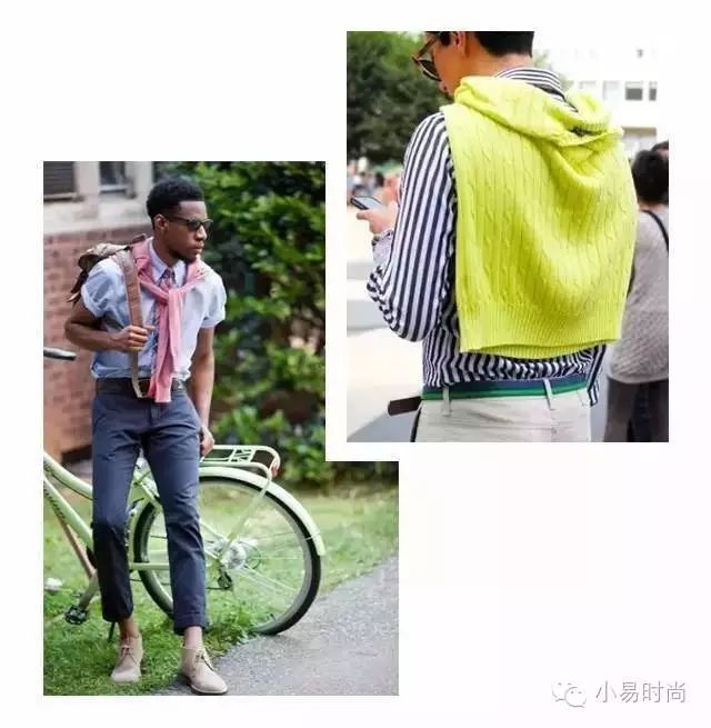 针织衫披在肩上不是一种新创造的穿法,这是Preppy的优良传统。在闲暇时刻,浅色的衬衫和休闲西裤是必备,一条披着的针织衫可以应对天气变化,也增加造型的时髦程度。