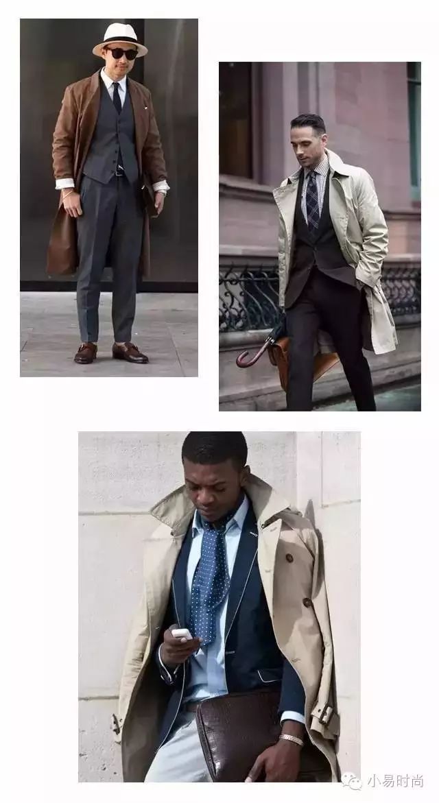 风衣穿在西服外可以穿出不一样的气质,搭配深色的合体西服就像纽约的金融界精英,搭配花哨的西服则像孔雀男士,搭配大地色系的西服就显出知识分子的气息。