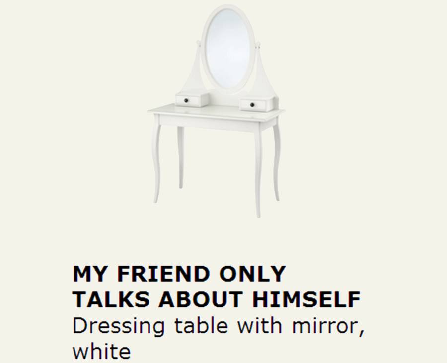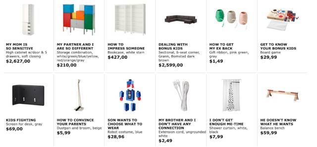 广告公司经过了大量调研和社会洞察,通过google真实的搜索数据,整理出人们常常遇见的家庭、社交、情感等矛盾和问题,再和宜家的产品配对组合,推出了“购物疗法”主题的营销活动。这些幽默的名字列举出人们的生活情景,既真实又可爱,让人不自觉地浏览完整个网站。