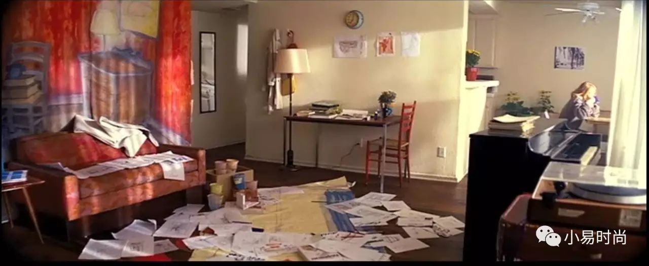 后来米娅搬去了男主小塞家里,同居生活从一开始的甜蜜,到后来小塞跟乐队四处巡演,两个人长期分居,感情逐渐变淡,客厅的地上堆满了米娅的剧本稿子。客厅的墙上涂满了红色壁画,画里的墙壁有转角,不仔细看,会让你分不清这个转角到底是画中的,还是真实的存在。恍惚时好像下面的红沙发,就存在于画中。