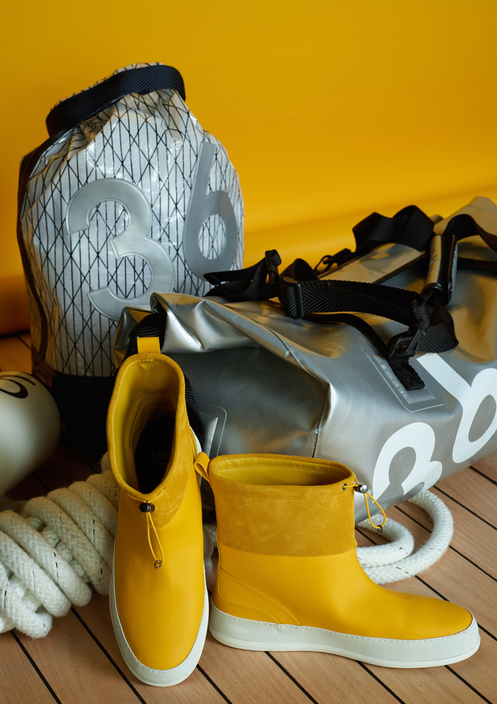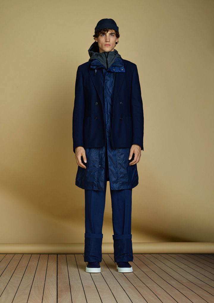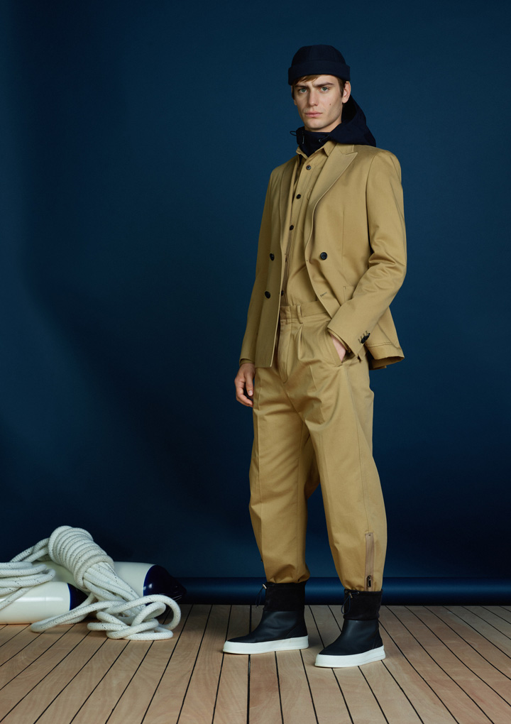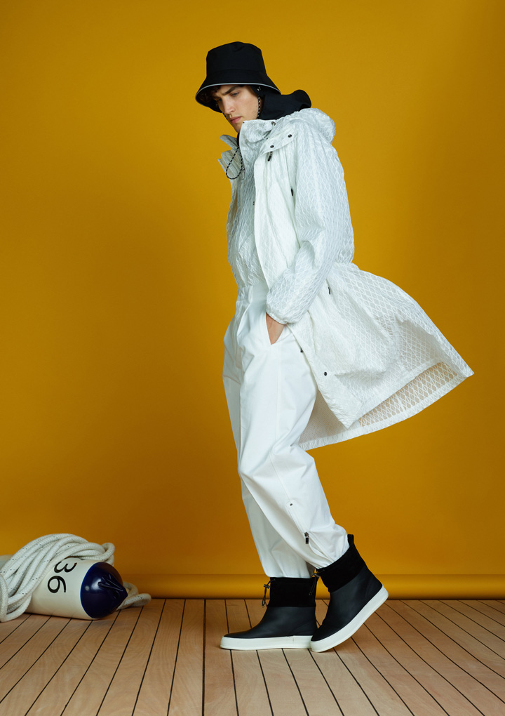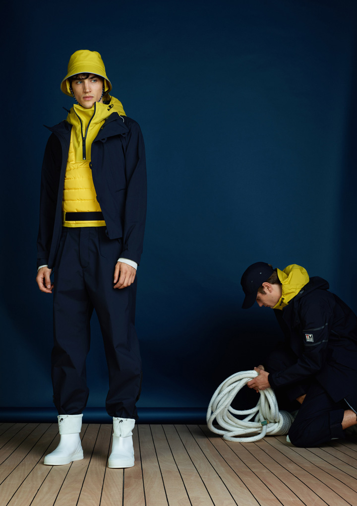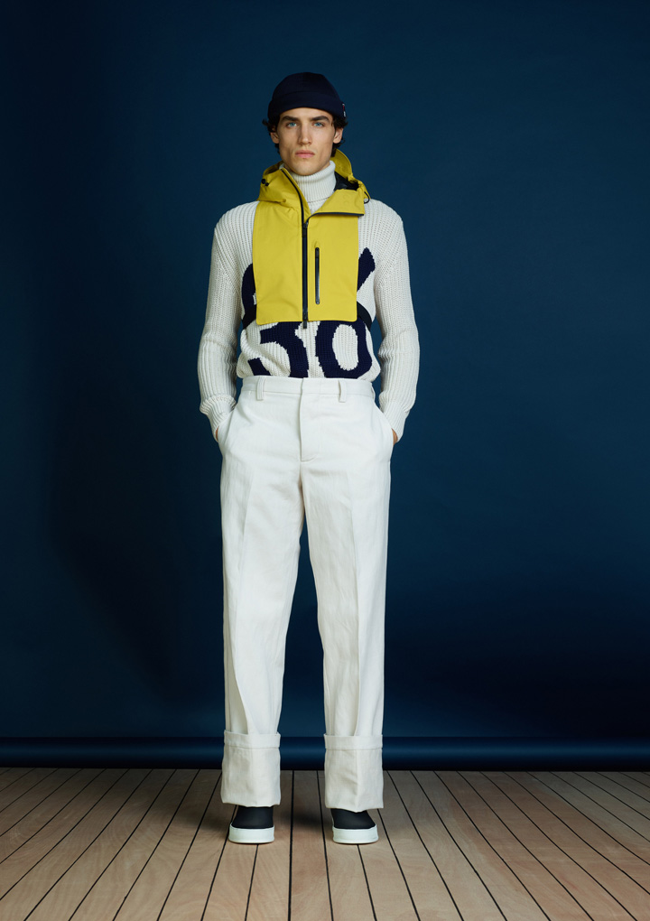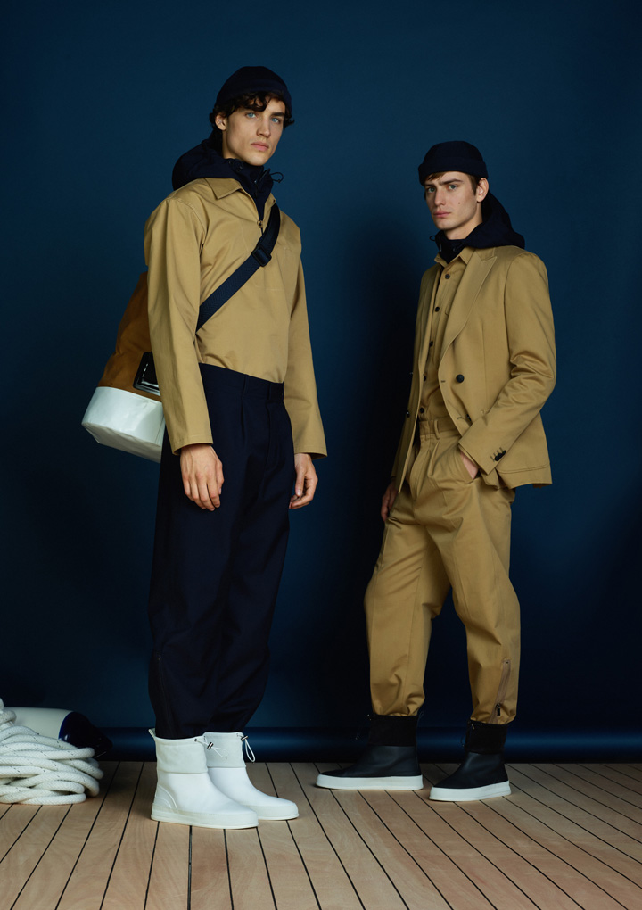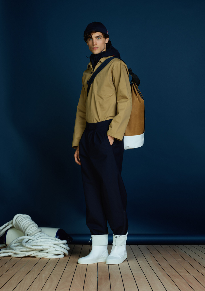 本季,轮廓利落不失优雅随性,运动服饰的多层次搭配与创意剪裁,先锋的细节设计以及对于航海主题图案的大面积使用,唤醒人们对于自由和探险的渴望。配饰同样沿用复古帆船赛元素,主打高科技美利奴羊毛TECHMERINO?波形运动鞋和表面贴胶处理皮质短靴,别出心裁地搭配由航海布制成的具有立体视觉感的彩色帆船包、防水TECHMERINO?背包、航海兜帽和沿帽。