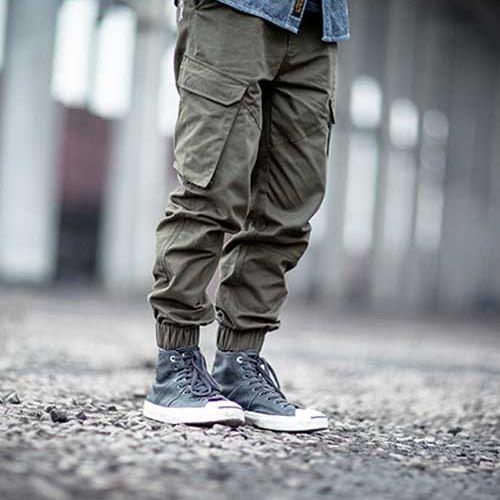 工装裤尽量选择大口袋的,宽裤筒的,因为纹理和印花的拼接会让上身显得很大气,如果选了紧身裤就显得格格不入了。