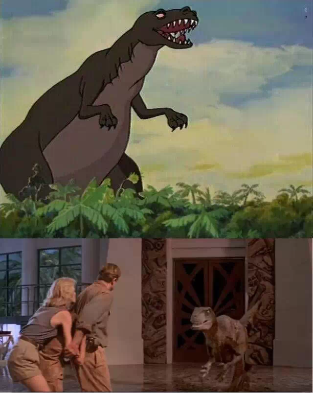 提起灾难片,怎么会没有恐龙,海尔兄弟在第15集就通过时空隧道回到了恐龙时代(原来《海尔兄弟》还是一部穿越剧),和恐龙来了个照面;而侏罗纪公园是利用先进技术用恐龙血液将恐龙复活,真麻烦,不如穿越来的快。