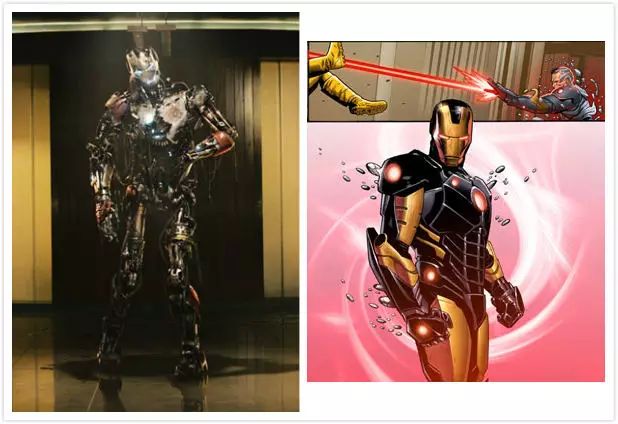 所以,他的设计参考了老爸造型。比如,首次亮相,一身残破,这套黑色和金色相间的装甲,就出自2013-14年的漫画《Marvel NOW!》中的42号钢铁侠战衣。