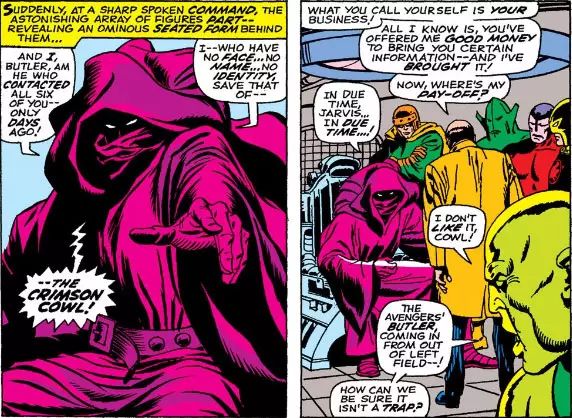 此处的设计参考了他在漫画中的首次亮相,披着红色斗篷,并自称为“绯红斗篷”(Crimson Cowl)。