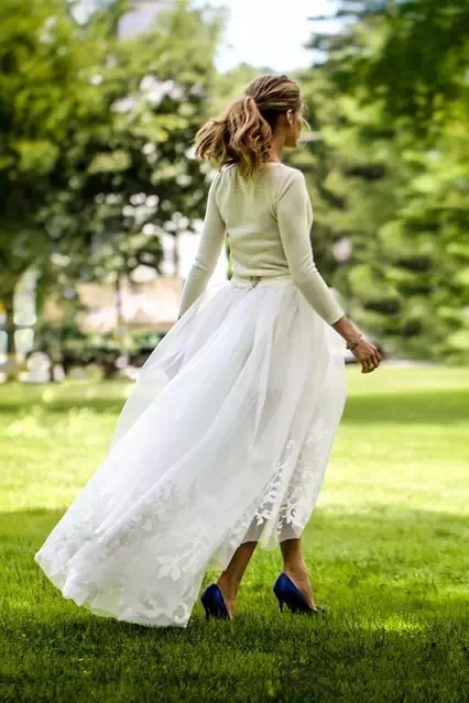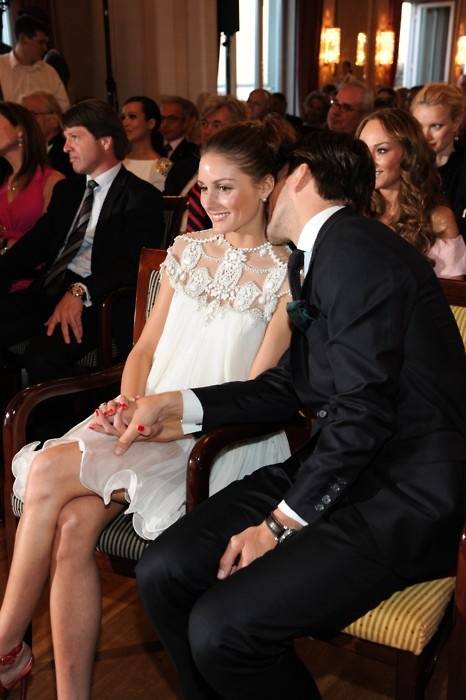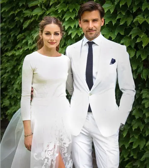 Olivia的婚纱也很特别,是好友Carolina Herrera定制的。没有传统的长鱼尾,用针织衫加白短裤、白纱裙就搞定了,不过效果随性又可爱。
