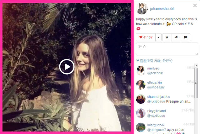 1月2日Johannes在Instagram上分享了一段唯美的度假视频,女友Olivia也在视频中大方展示起了订婚戒,Johannes写 道:“Happy New Year to everybody and this is how we celebrate it: OP said Y E S!”