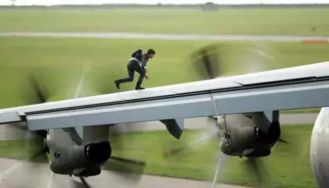 1、影片中“徒手扒飞机”的惊险戏码由阿汤哥本人亲自实拍完成。当时一共拍了八遍,在1500米高空的飞机外壳上悬挂了20多分钟,他和飞机之间仅仅用了一条非常细的绳索相连。
