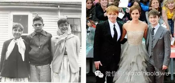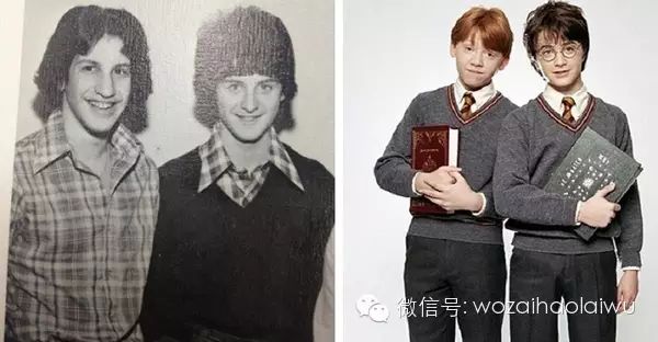 16. 左边是一张1970年代的照片,他们还留着披头士流行的发型,而右边是哈利波特的剧照