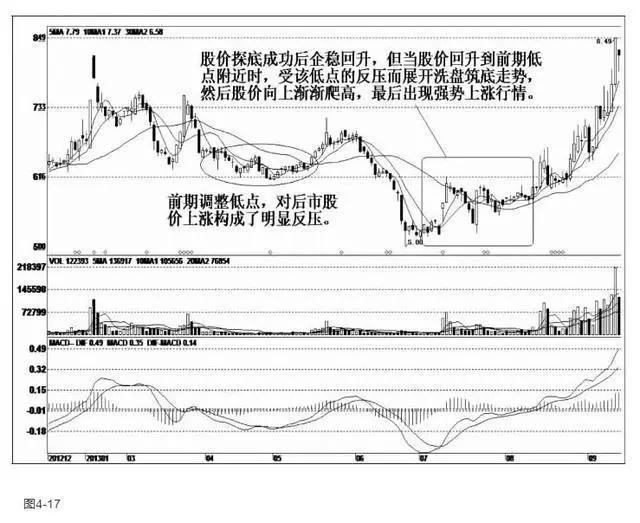 【图4-17】上工申贝:该股见顶后逐波走低,2013年7月股价企稳回升,当股价反弹到前期低点附近时,庄家利用前期低点位置展开洗盘调整,因为该位置已由原先的支撑作用转化为新的压力作用。这时,不少散户看到股价不能向上突破,而选择了抛售操作,庄家洗盘如愿以偿,此后股价渐渐向上攀高。