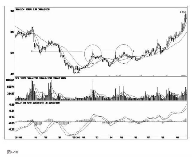 【图4-18】汉商集团:庄家在下跌过程中吸纳了不少的低价筹码,不久股价见底企稳后开始向上反弹。当股价反弹到前期低点附近时,股价遭到明显的抛压,多次攻而不破,不少散户在此选择抛出。但股价并未出现大幅下跌走势,经过短暂的蓄势整理后,股价进入盘升行情。