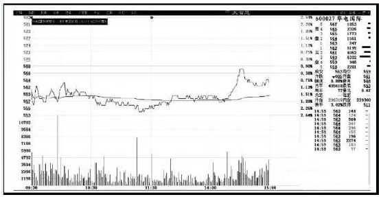 如图1所示,华电国际(600027)上午开盘后,经过短暂的多空搏斗后开始一路震荡走软。股价在下午14点15分之后开始发力,很快就被拉起,这时大盘也开始走强,整个盘面大部分个股都出现了拉高的现象。最后股价收于开盘价之上。实际操作过程中,投资者如果遇到这种走势情况,为了尽可能降低当天操作的风险,可以在收盘前的一两分钟买进。出现这种情况的走势,一般第二天开盘就会有一个冲高的过程,新股民便有可能快速套利。