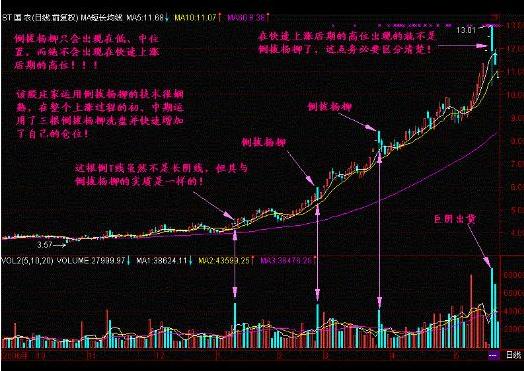 提醒:倒拔杨柳只会出现在离庄家成本不太远的突破重要阻力位、或上升的初、中期等位置,而绝不会出现在拉升股价以后的高位,这点务必要分辨清楚!仔细想想,倒拔杨柳的目的无非是洗盘和快速加仓,但到了高位主力还有什么理由这么做呢?