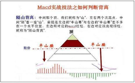 中间那个顶,我们就称为“山”,左右两个次高点,中间“隔”着一座“山”。前提是左边的“半山腰”与右边的“半山腰”差不多在一个水平位置,左边所对应的MACD红柱,右边对应出现绿柱,就称为“隔山背离”。