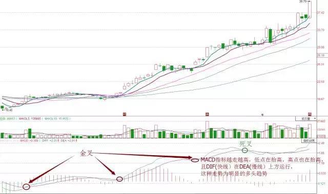 如图上,股价从低位开始上涨,MACD指标也随着股价的走高而走高,股价在回调过程中,MACD指标回调的低点也一个比一个高,且MACD指标的DIF(快线)始终位于DEA(慢线)上方,说明此事股价处于上升趋势中,可耐心持股待涨。