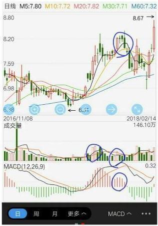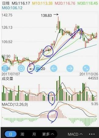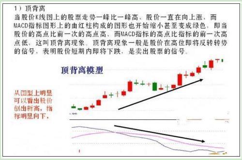 当股价K线图上的股票走势一峰比一峰高,股价一直在向上涨,而MACD指标图形上的红色柱构成的图形也开始缩小甚至变成绿色,即当股价的高点比前一次的高点高,而MACD指标的高点比指标的前一次高点低,这叫顶背离现象。顶背离现象一般是股价在高位即将反转转势的信号,表明股价短期内即将下跌,是卖出股票的信号。