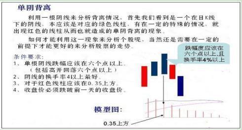 利用一根阴线来分析背离情况,首先我们看到是一个在日K线下的阴线,本应该是对应的绿色线柱,有在一定的特殊的情况,就出现红色的线柱从而也就造成的单阴背离的现象。