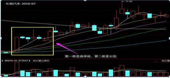 2、只有一个涨停板,另外一个是长阳,第二根涨停更佳;