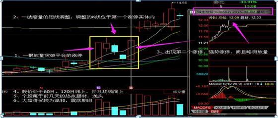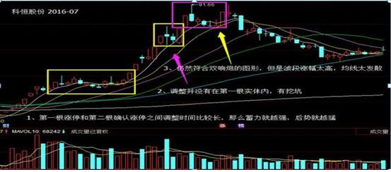 第一根涨停是一种态度,随后的缩量回调都在第一根涨停实体内,所以第二根涨停的抛压基本不大。并且第二根K线最好不要放太大量,因为这样属于自然涨停,趋势上的自然涨停。并且,调整的时间越长,调整期间越强势,调整K线实体越小,第二个涨停板越强,后市的涨势越凶猛,当然如果再是热门题材的龙头,锦上添花。