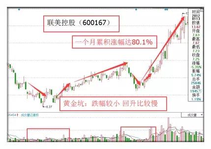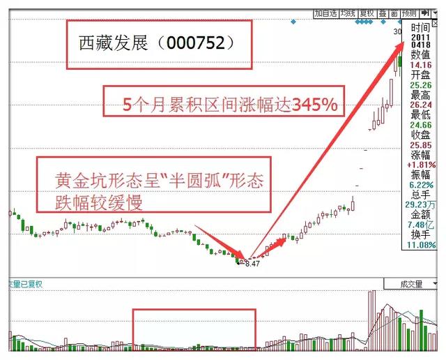 “黄金坑”内的成交量很小,再度拉起时成交量会变大大。“黄金坑”是为了震仓,坑底的成交量会非常的小,但再度拉起时,主力一般会把成交量做上去。
