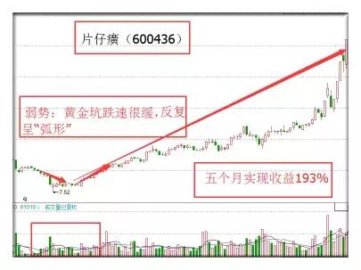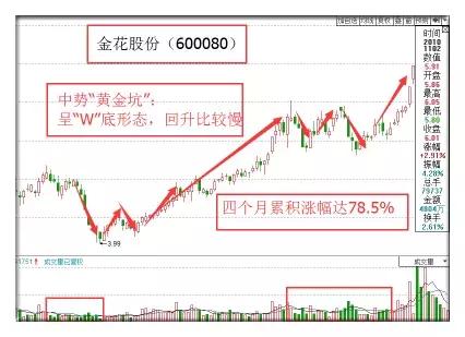 以上个股案例属于第三种形态:弱势的“黄金坑”,“弱势”不代表反弹力度弱,只是股价在回落和回升的时候一般很迟缓,并且会反复出现,但是每次幅度不大。当底部筑完后,股价就会开启一波上涨态势。