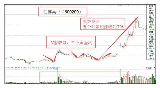 如上图案例所示,中势的“黄金坑”向下破位和向上拉升动作迅速,一般呈v型,此类个股出现此形态时,就是最佳买入时机,“黄金坑”只是主力给你设的一个陷阱,洗盘而已,只要在合适的买入点买进时,股票就会高开高走,迅速拉大阳线,以极强的技术形态向上突破。