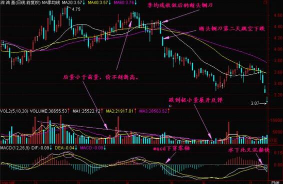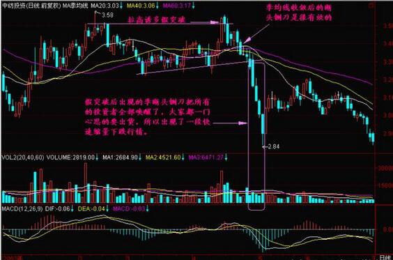 (3) 于是有一天卖出方突然用低于三条均线的价格大量卖出,当日收盘价跌破三条均线,形成“断头铡刀”。