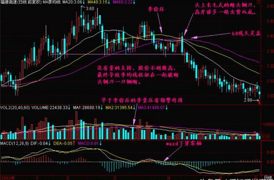 下图的个股有些特别,该股先是出现一次对季托平台的假突破动作,之后反身向下跌,在季均线系统收敛的情况下出现一根断头铡刀,醒悟过来的投资者纷纷加入到杀跌行列,可惜因为大家都要出货,而接盘的人并不踊跃,所以造成了缩量快速下跌的局面。