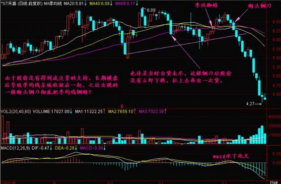 小结:有效的断头铡刀一般出现在均线系统相对收敛的情况下,如果均线系统不收敛的话,就可能演变为“大刀砍”了,因为均线系统不收敛的话暖空气的力量会把股价抬得弹跳起来的,所以大刀砍后必有弹跳就是这个道理。
