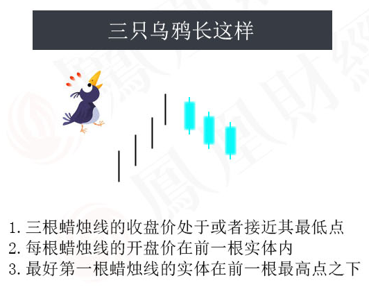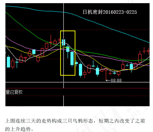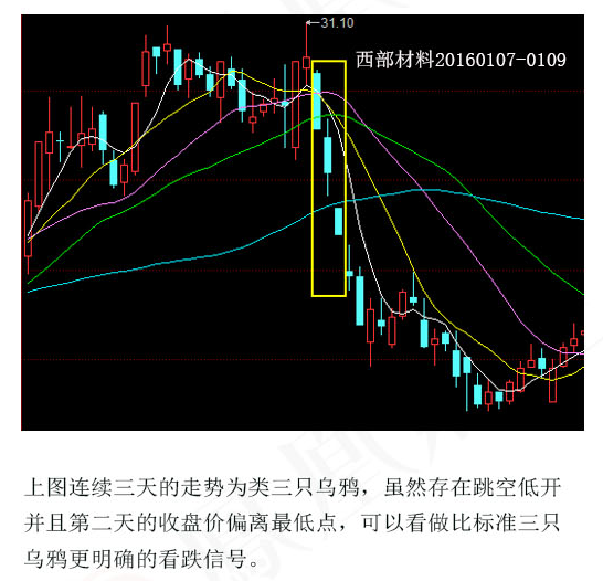 中国的传统观念认为,乌鸦是不吉之物,意喻不祥,所以三只乌鸦后市看跌的意味深重。“三只乌鸦”出现在下跌趋势启动之初,空头取得优势并开始发力,务必注意这种K线成立的前提,是发生在下跌趋势成立的初期。