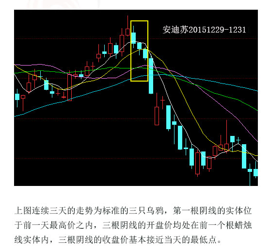 1、在上升趋势中,如果出现在顶部和下降途中,而且三日的收盘价都向下跌,表示卖盘很重需要及时卖出;