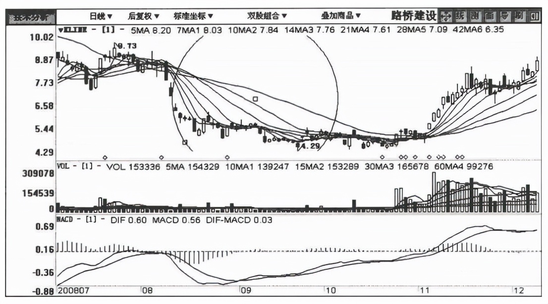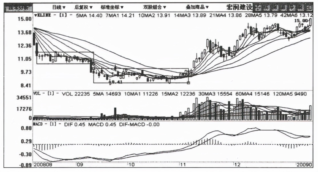 (6)突破重要压力位置。建仓完成时通常都有一些特征,如股价先在低位构筑一个平台,然后再缓缓盘出底部,均线由互相缠绕逐渐转为多头排列。特别是若有一根放量长阳突破盘整区,更加可确认建仓期完成,即将进入下一个阶段。