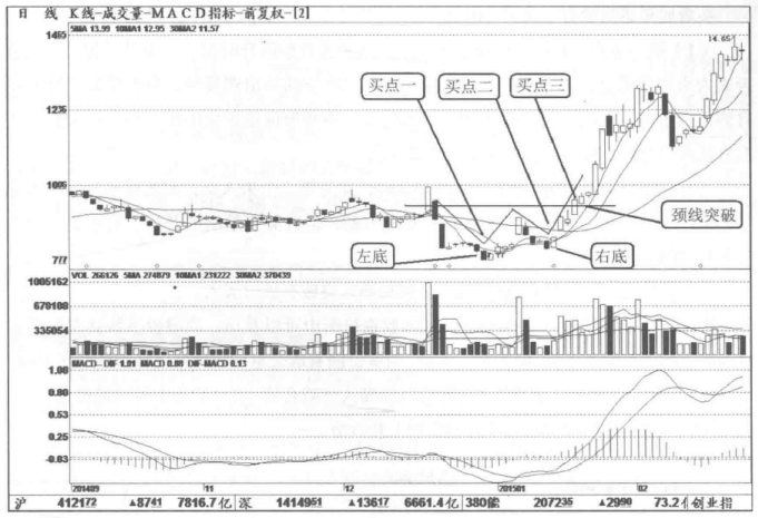 (2)第二买点:当股价向上突破颈线时,此为第二个买入点,亦为最强烈的买入信号。虽然此处股价与最低点相比已有一定的升幅,但升势只是刚刚开始,后市仍具较大的上升空间。
