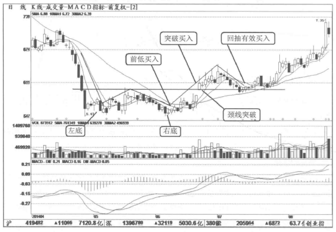 (2)买点二:当股价完成右底并放量突破颈线时,是积极的买进信号。股价突破颈线后,将加速脱离底部形态,此时应立即买入。