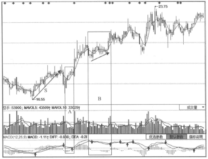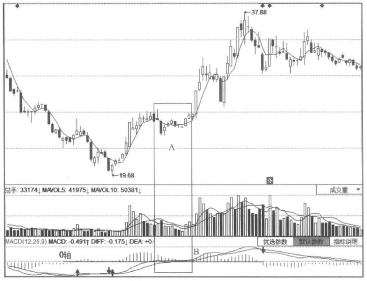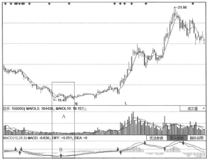 图7-3是长春一东(600148)日线图,当双线在0轴下向上运行时,进入A区域后,出现了向上突破0轴的情况。其后DIFF线开始震荡向下,但在接近DEA线时并未跌破,而是与DEA线距离较近状态下在0轴之上水平运行,形成了空中缆绳形态。其后在B区域,红柱快速变长,DIFF线向上与DEA线拉开距离,双线向上发散,这说明股价已经结束短线调整,即将恢复上涨,应果断买入。
