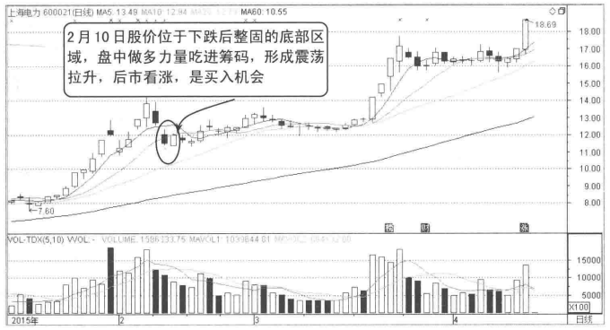 图4-2所示为上海电力的走势,股价经过下跌后,逐步走出一波上涨行情。在2月10日当天震荡拉升突破10日均线。此阶段出现这种走势是看涨信号,第二天股价继续走强,后市迎来上涨行情。
